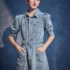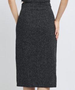 – Chanel-inspired fabric, high-waisted pencil skirt design.