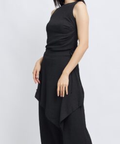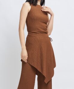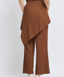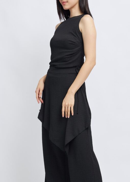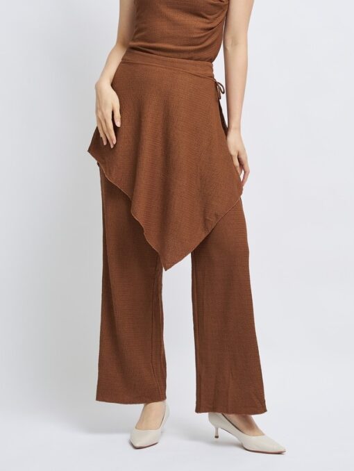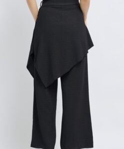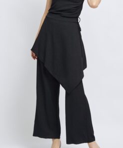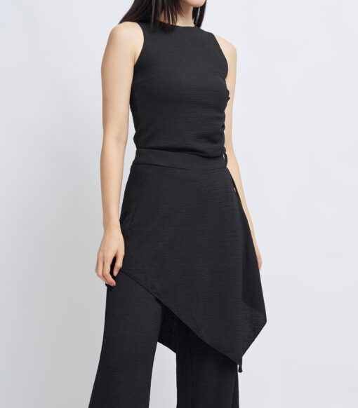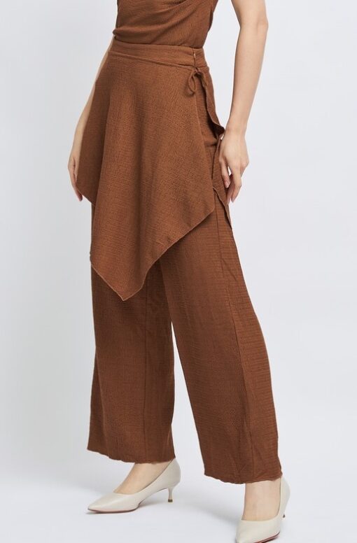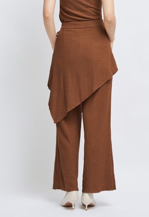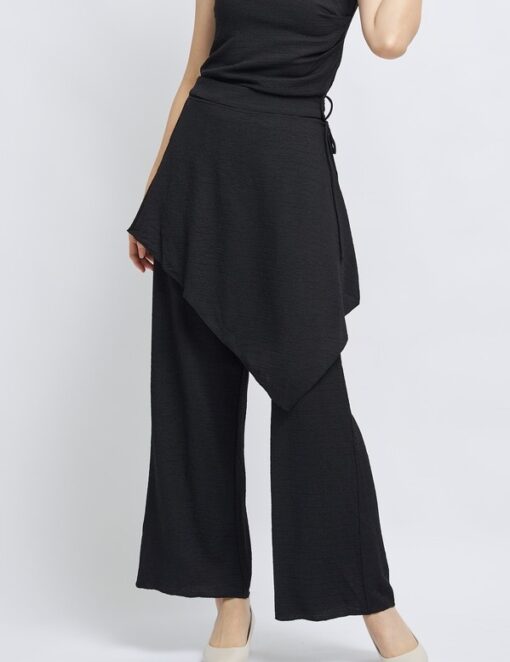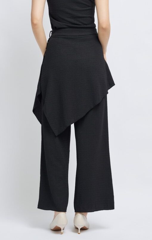 – High-waisted, wide-leg silhouette, with a diagonally cut, layered skirt design (with side ties for closure).