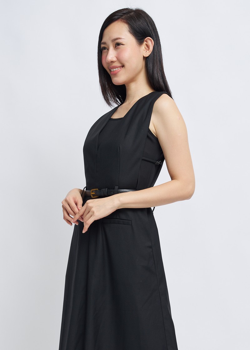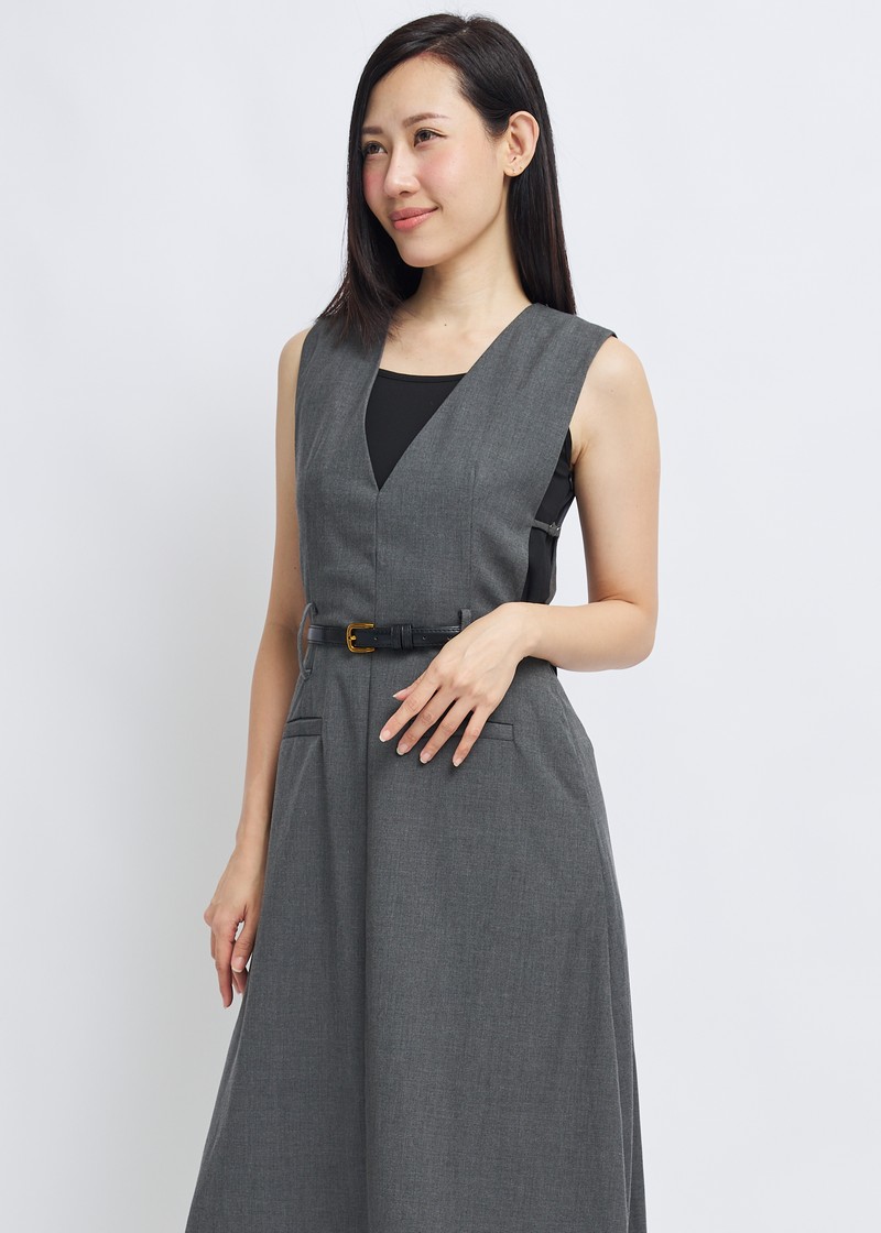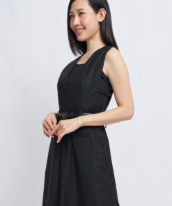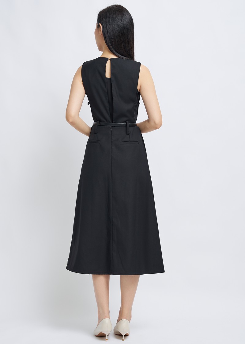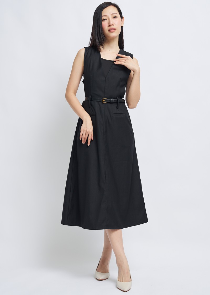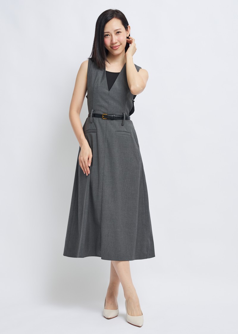 -Features include a three-dimensional V-neck design, a cinched waist with a belt, and an A-line skirt.