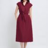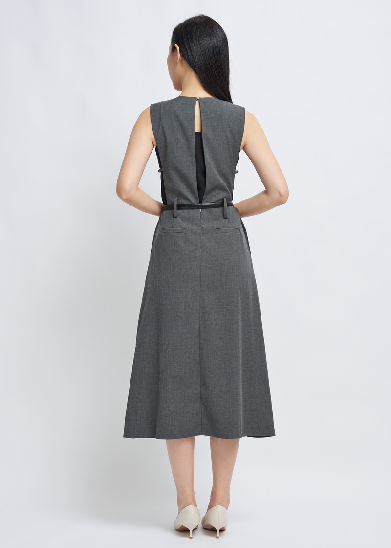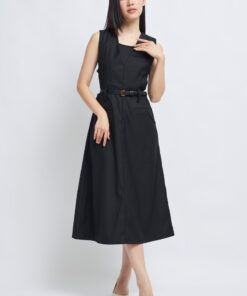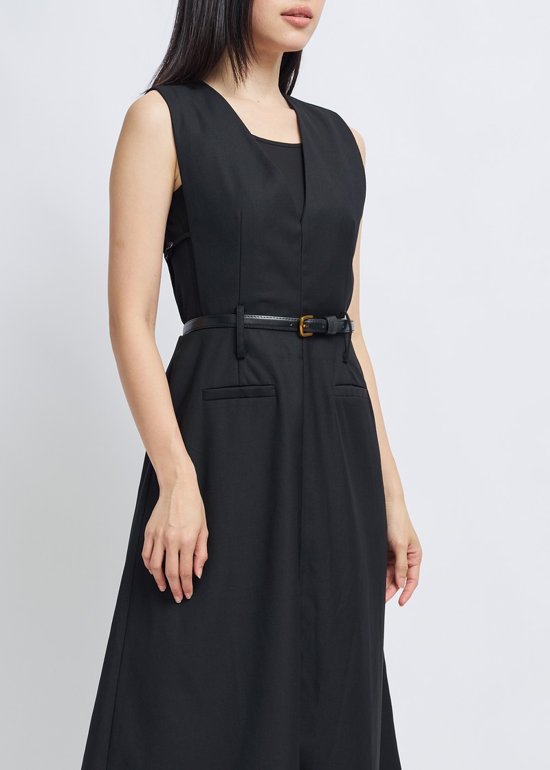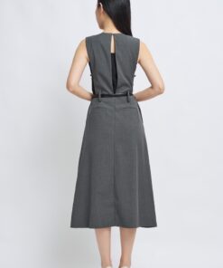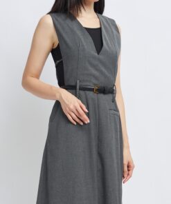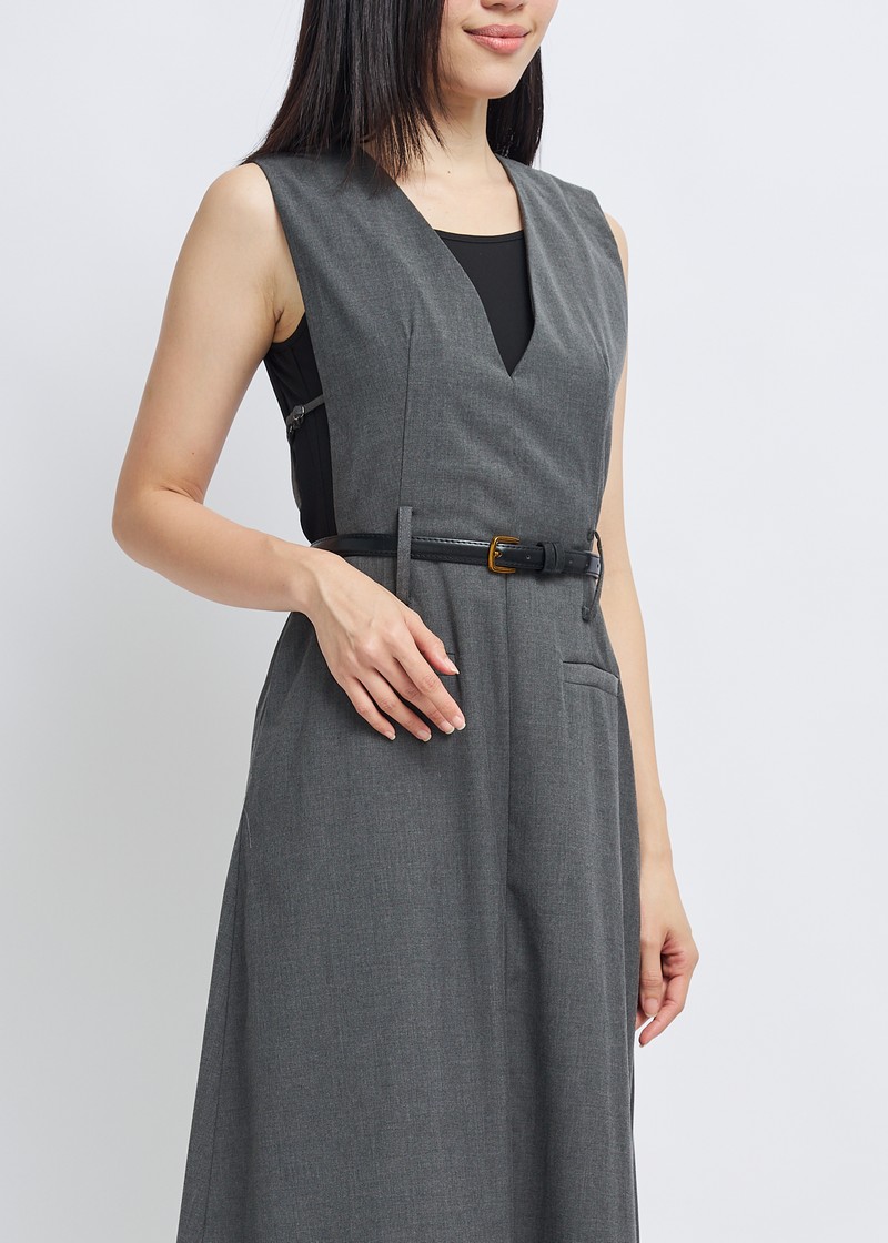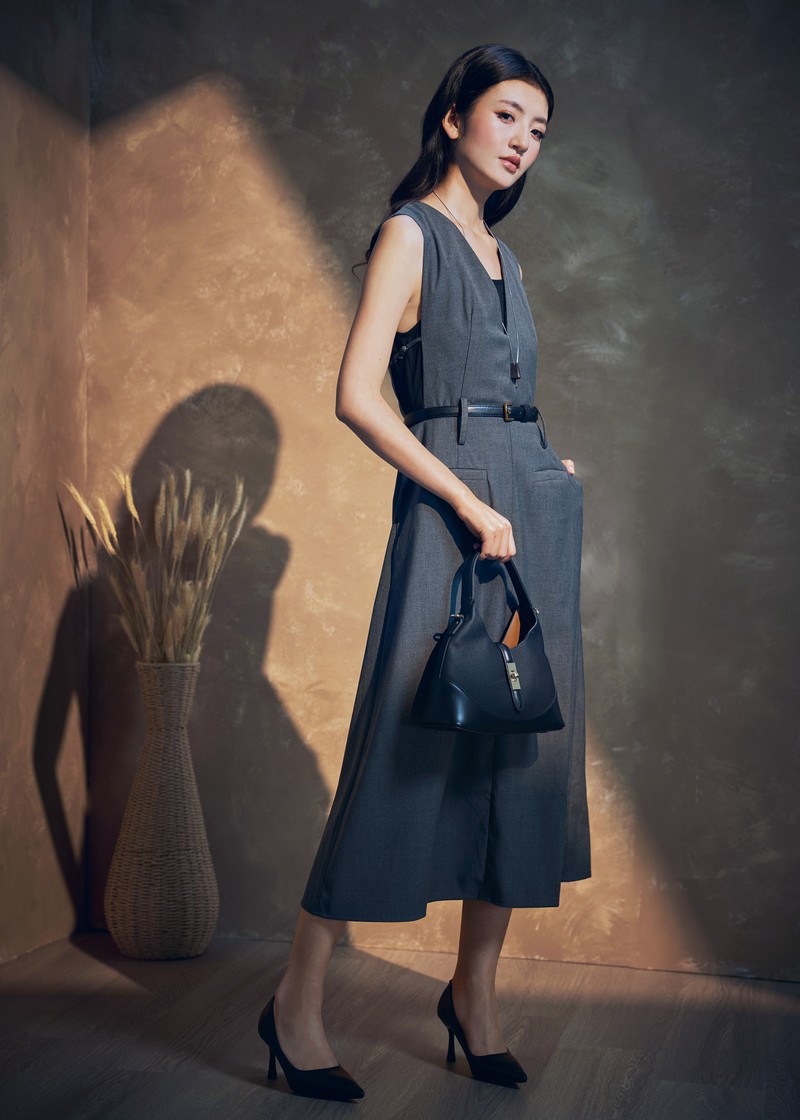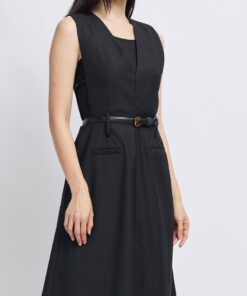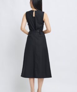 -Features include a three-dimensional V-neck design, a cinched waist with a belt, and an A-line skirt.