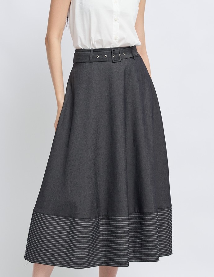 – High-waisted A-line skirt, midi design.